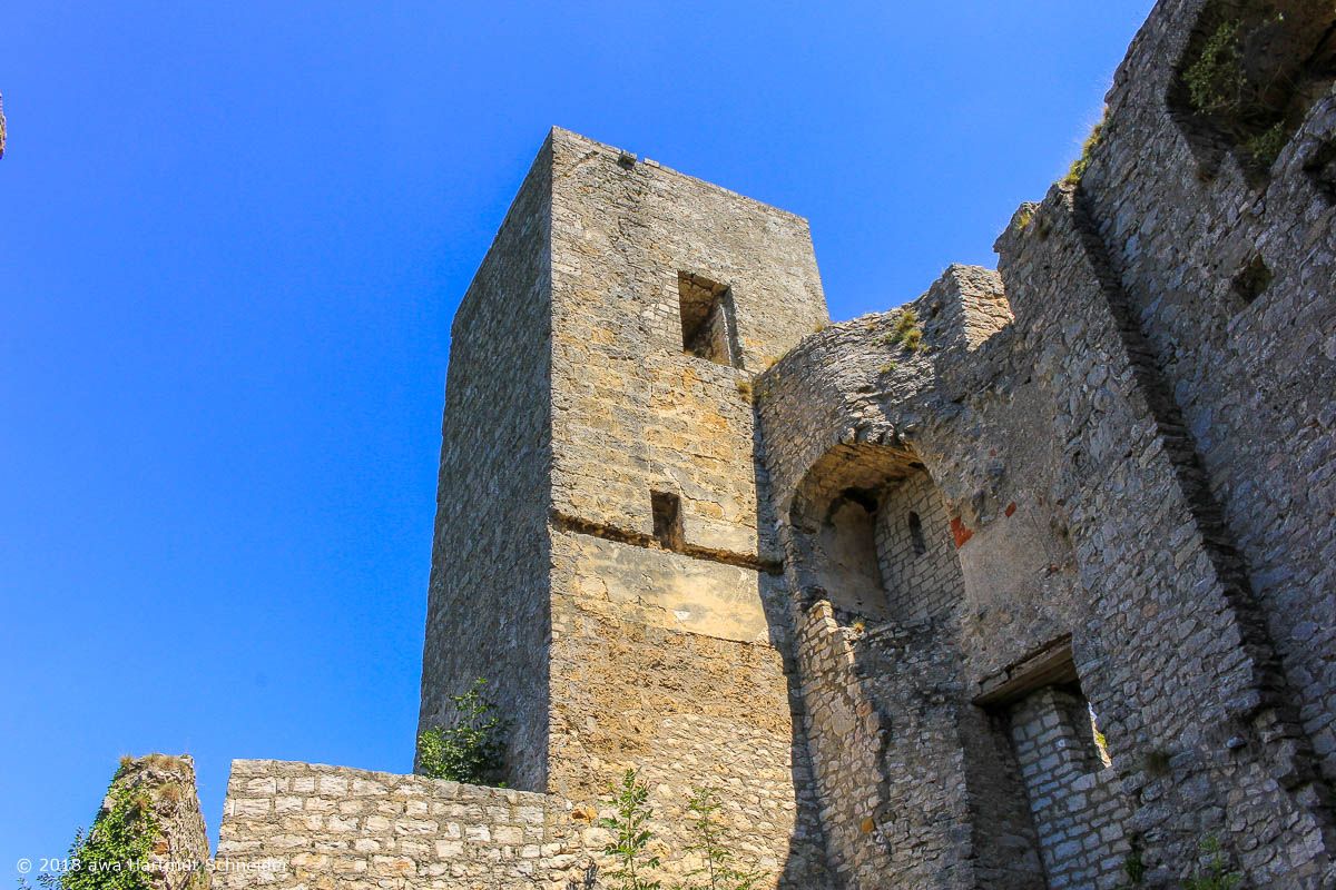 Die Wanderung führt uns zuerst hinein ins idyllische Donntal, zunächst am Bachlauf des Donn entlang mit seinem kristallklaren und eiskaltem Wasser, bis wir am Wanderweg rechts abzweigend zu einem steilen Albtrauf-Anstieg gelangen, welcher uns nach leicht anstrengender Wanderstrecke, vorbei an der Mondmilchhöhle (?) schließlich bis zur Burgruine Sperberseck führt.